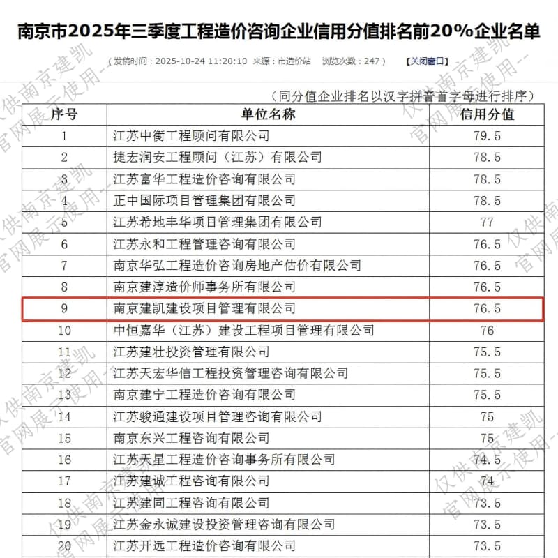 恭喜我司入选“南京市2025年三季度工程造价咨询企业信用分值排名前20%企业名单”
